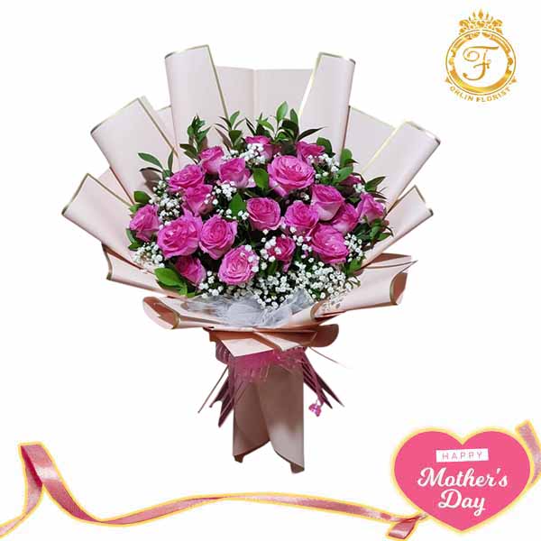 Bouquet hari ibu dengan 20 tangkai bunga mawar pink dan baby breath